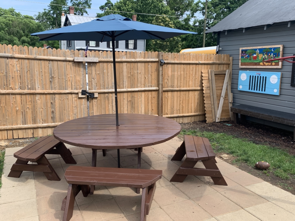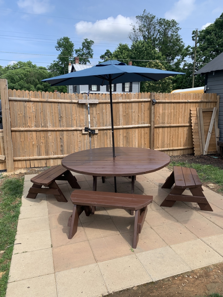 Custom, handmade round picnic table. 6 foot round table with 3 foot wide chairs (x4) seats 8 adults.